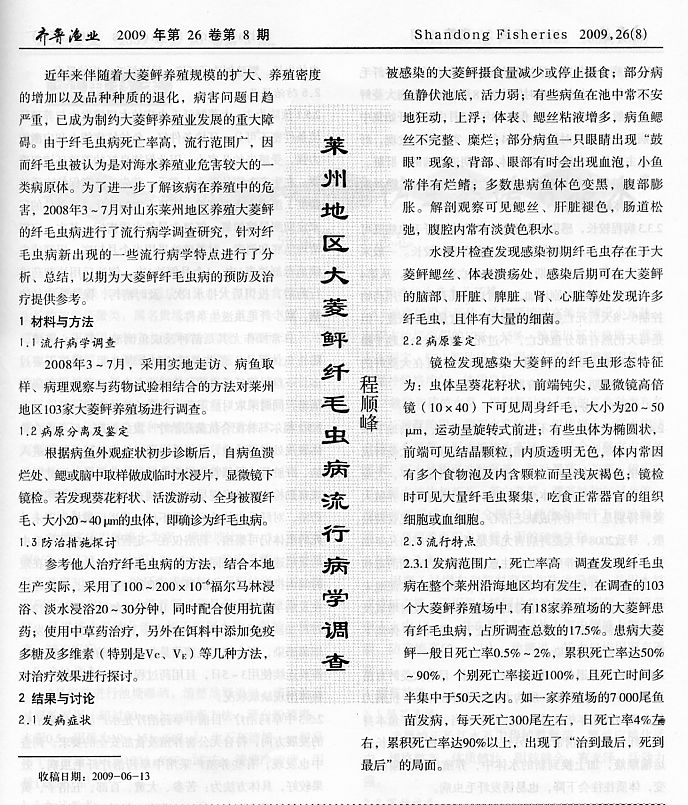萊州地區(qū)大菱鲆纖毛蟲(chóng)病流行病學(xué)調(diào)查1