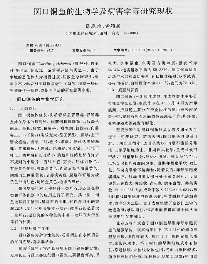 圓口銅魚的生物學(xué)及病害學(xué)等研究現(xiàn)狀1