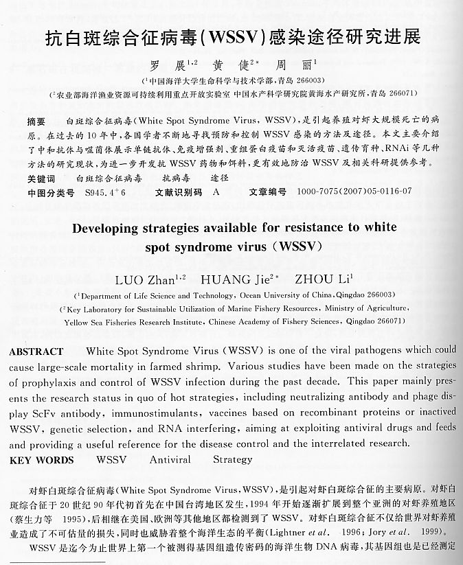 抗白斑綜合征病毒(WSSV)感染途徑研究進展1