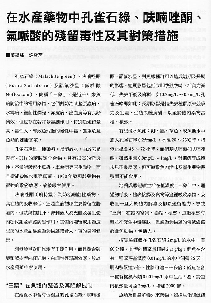 在水產(chǎn)藥物中孔雀石綠、呋喃唑酮、氟哌酸的殘留毒性及其對(duì)策措施1