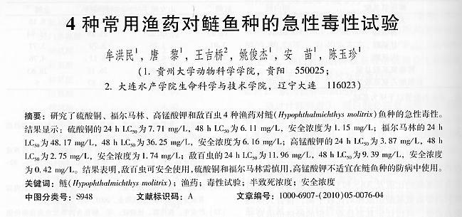 4種常用漁藥對(duì)鰱魚種的急性毒性試驗(yàn)