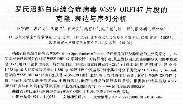 羅氏沼蝦白斑綜合癥病毒W(wǎng)SSV&nbspORF147&nbsp片段的克隆、表達(dá)與序列分析