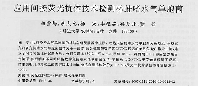應(yīng)用間接熒光抗體技術(shù)檢測(cè)林蛙嗜水氣單胞菌