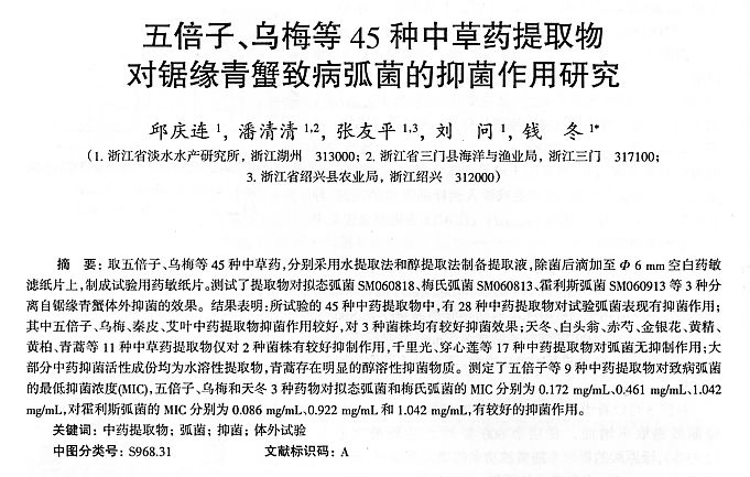 五倍子、烏梅等45種中草藥提取物對(duì)鋸緣青蟹致病弧菌的抑菌作用研究