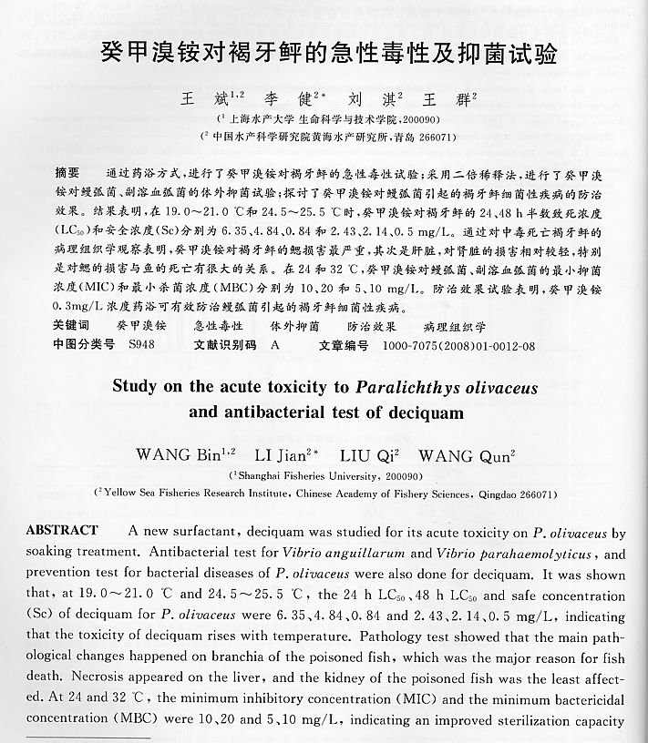 癸甲溴銨對(duì)褐牙鲆的急性毒性及抑菌試驗(yàn)1