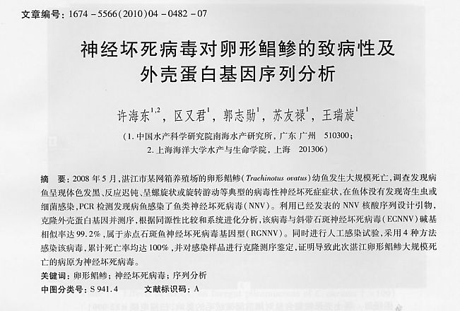神經(jīng)壞死病毒對(duì)卵形鯧鲹的致病性及外殼蛋白基因序列分析