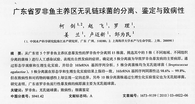 廣東省羅非魚(yú)主養(yǎng)區(qū)無(wú)乳鏈球菌的分離、鑒定與致病性