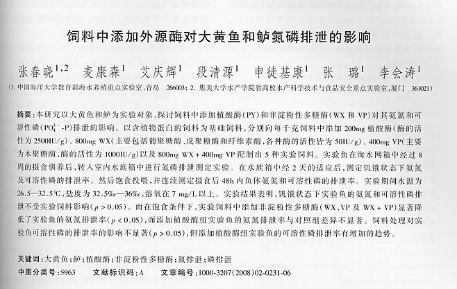 飼料中添加外源酶對大黃魚和鱸氮磷排泄的影響