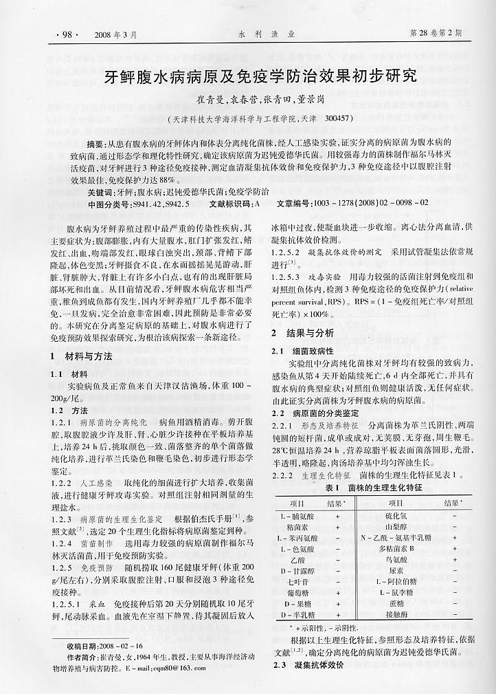 牙鲆腹水病病原及免疫學(xué)防治效果初步研究1