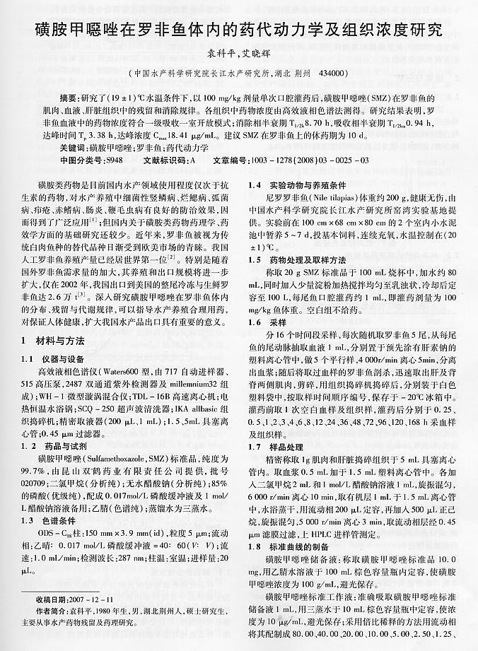磺胺甲噁唑在羅非魚體內(nèi)的藥代動力學及組織濃度研究1