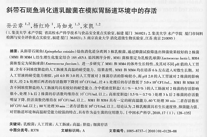 斜帶石斑魚消化道乳酸菌在模擬胃腸道環(huán)境中的存活