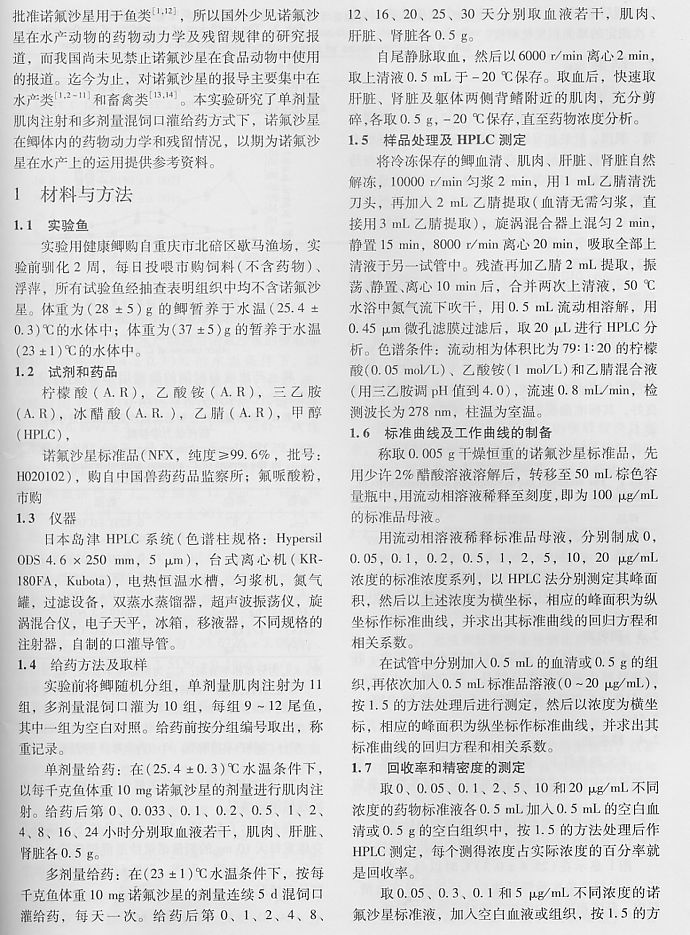 諾氟沙星在鯽體內(nèi)的藥動(dòng)學(xué)及殘留研究2