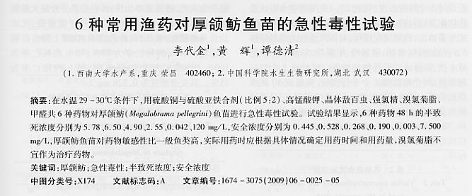 6種常見漁藥對厚頜魴魚苗的急性毒性試驗