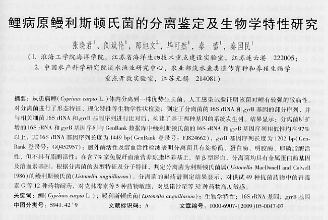 鯉病原鰻利斯頓氏菌的分離鑒定及生物學(xué)特性研究