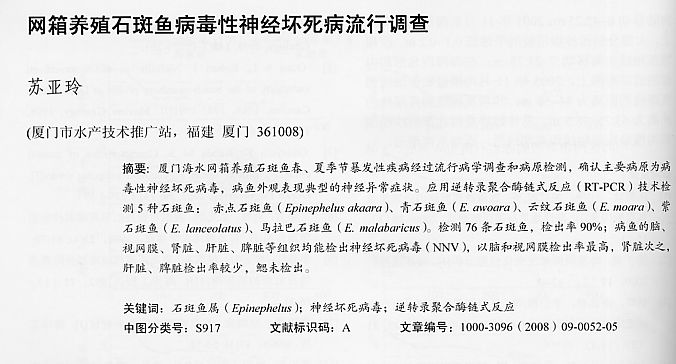 網(wǎng)箱養(yǎng)殖石斑魚(yú)病毒性神經(jīng)壞死病流行調(diào)查