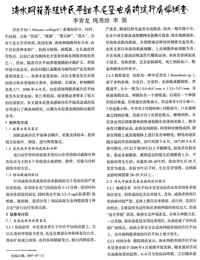 海水網(wǎng)箱養(yǎng)殖許氏平鮋本尼登蟲病的流行病學(xué)調(diào)查1