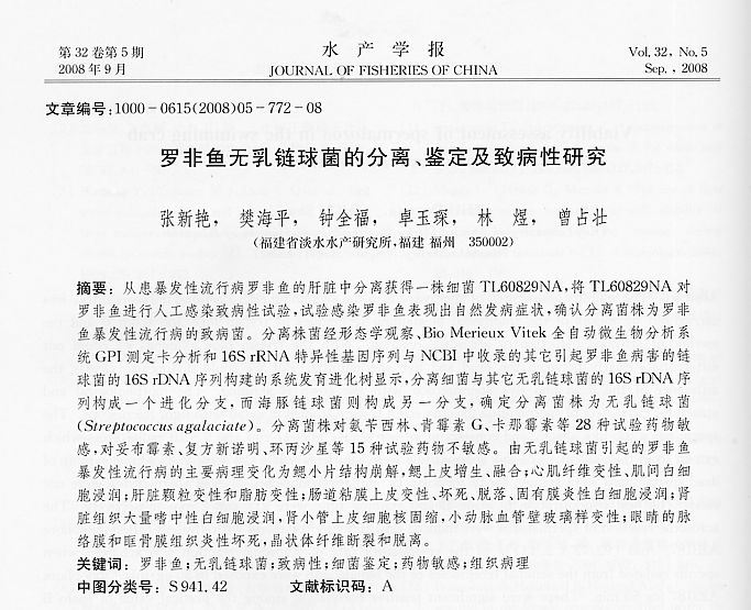 羅非魚無乳鏈球菌的分離、鑒定及致病性研究
