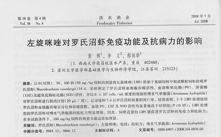 左旋咪唑?qū)α_氏沼蝦免疫功能及抗病力的影響
