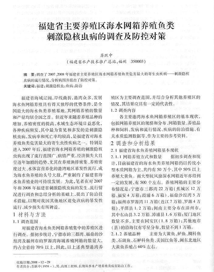 福建省主要養(yǎng)殖區(qū)海水網(wǎng)箱養(yǎng)殖魚類刺激隱核蟲病的調查及防控對策1