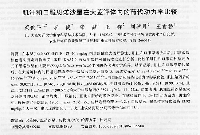 肌肉和口服恩諾沙星在大菱鲆體內(nèi)的藥代動力學比較