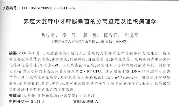 養(yǎng)殖大菱鲆中牙鲆腸弧菌的分離鑒定及組織病理學(xué)