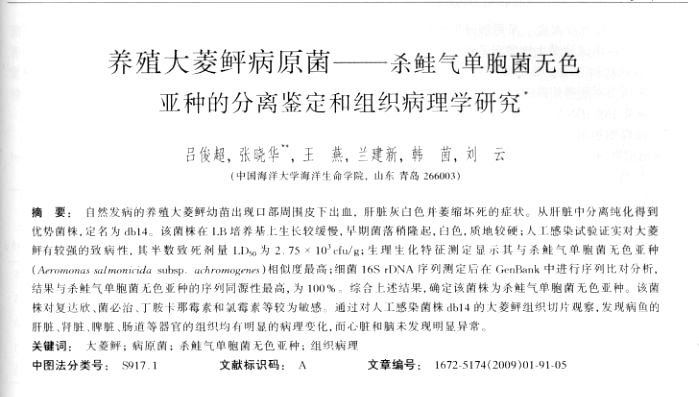 養(yǎng)殖大菱鲆病原菌--殺鮭氣單胞菌無色亞種的分離鑒定和組織病理學研究