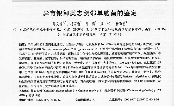 異育銀鯽類志賀鄰單胞菌的堅(jiān)定