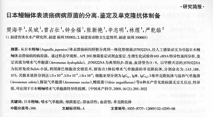 日本鰻鱺體表潰瘍病病原菌的分離、鑒定及單克隆抗體制備