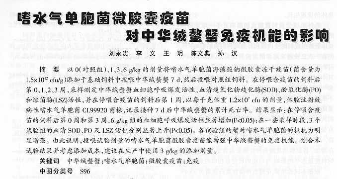 嗜水氣單胞菌微膠囊疫苗對(duì)中華絨螯蟹免疫機(jī)能的影響