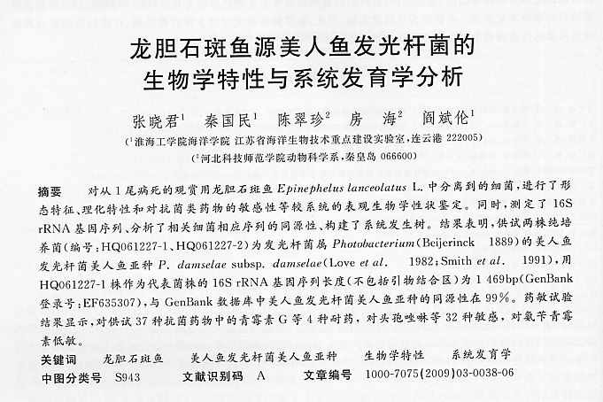 龍膽石斑魚源美人魚發(fā)光桿菌的生物學特性與系統(tǒng)發(fā)育學分析